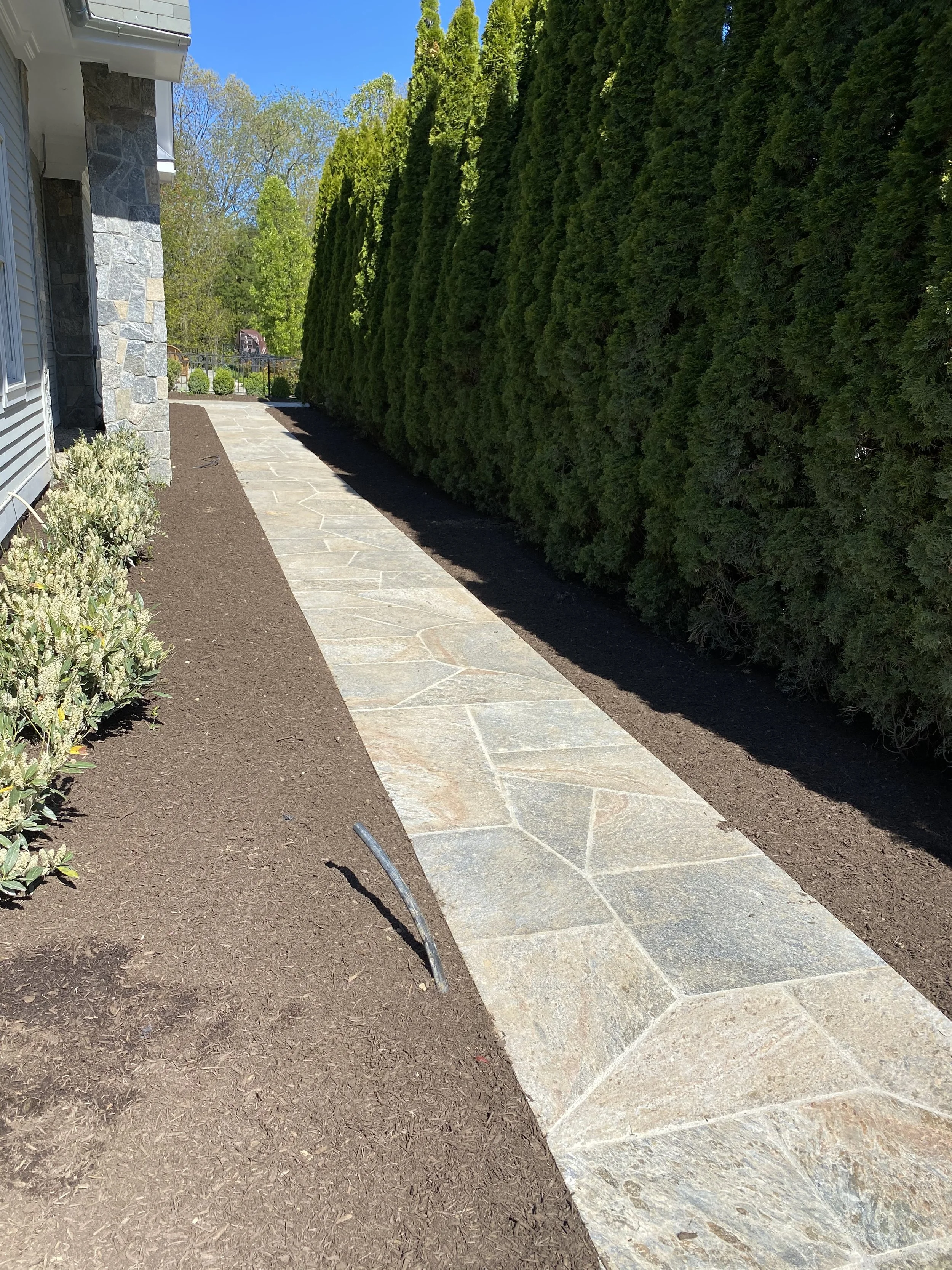 This custom natural stone walkway in Greenwich, Connecticut is crafted with Spruce Mountain flagging, laid in a flowing mosaic pattern that showcases the organic shapes and textures of each hand-selected stone. The cool grays, soft blues, and earthy undertones of the flagging blend beautifully into the surrounding landscape, creating a natural, timeless aesthetic.