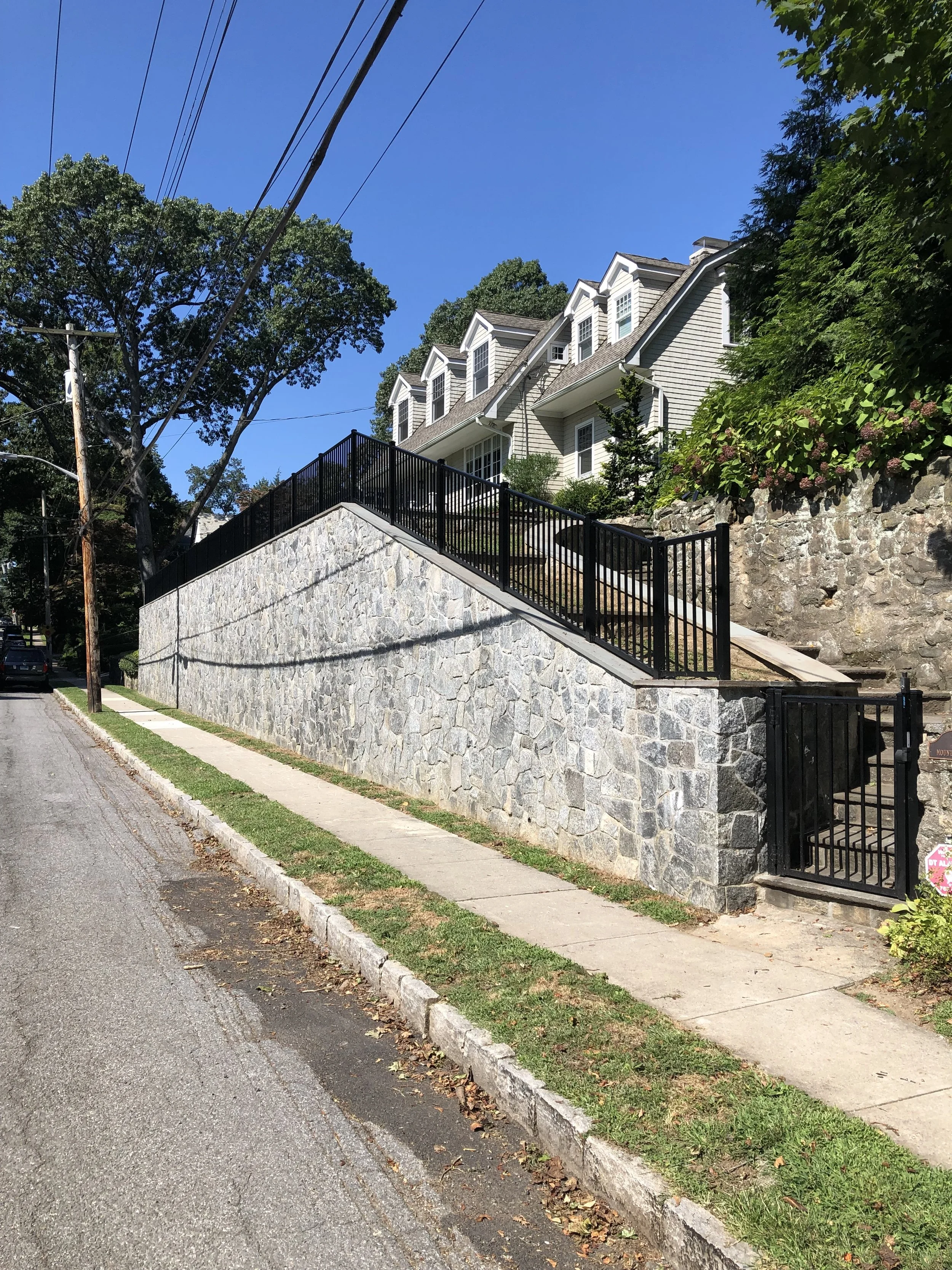Topping the structure is a 14-inch thermal bluestone cap, providing a clean, finished edge while adding contrast and durability. For both safety and visual appeal, the wall is finished with a sleek black aluminum railing, which complements the stonework without obstructing views.