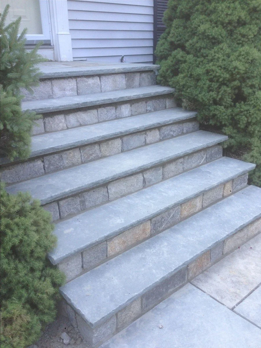 This elegant entrance in Greenwich, CT showcases a masterful combination of natural materials that blend classic New England character with refined craftsmanship. The step risers are built with hand-laid Connecticut fieldstone, offering a rich mix of earthy tones and rugged texture that anchors the entryway in timeless, regional charm.